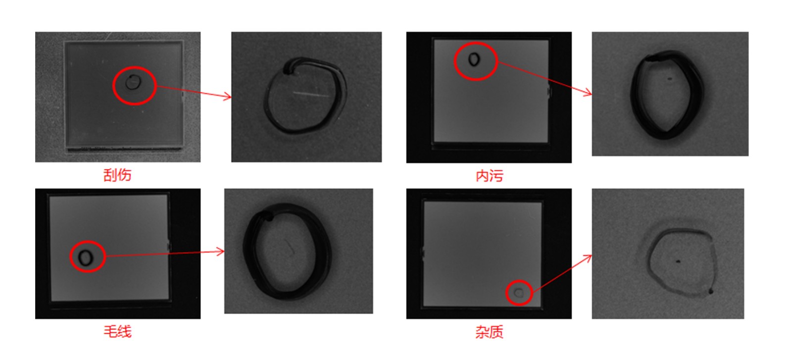 刮伤、毛线、内污、气泡、杂质、裂痕、切割不良、贴歪、白点、水纹、破损等缺陷